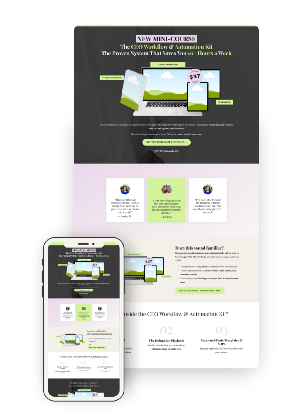 Full-length sales page with hero, benefits, social proof, pricing, FAQ, and footer CTA. Everything you need to convert visitors into buyers.