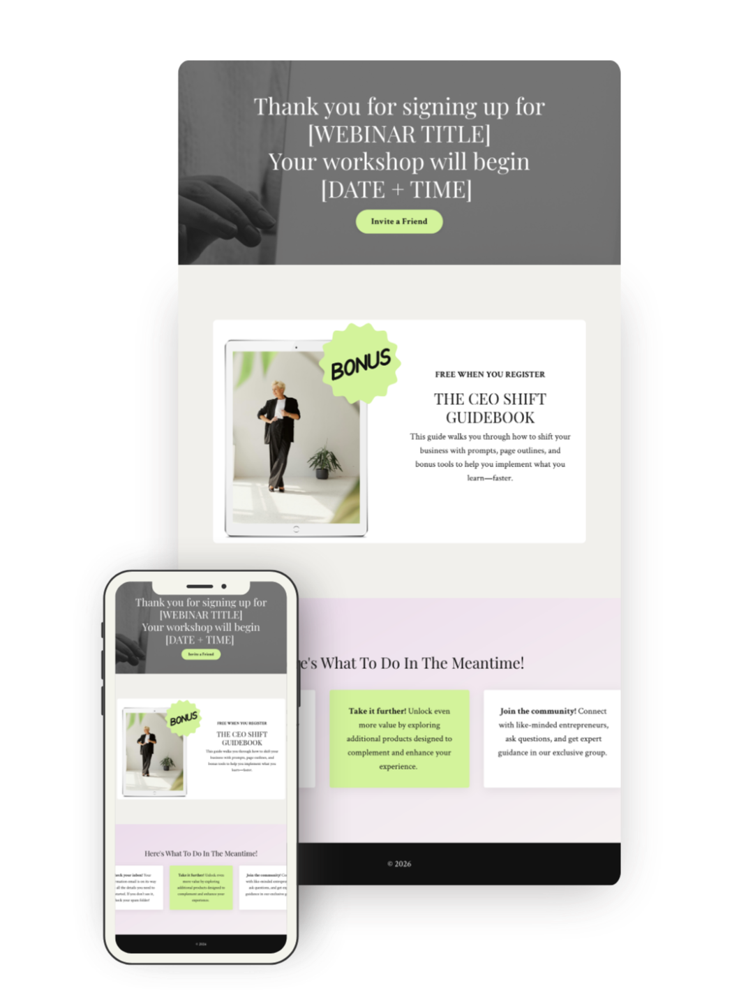 Post-registration page that builds anticipation and shares reminders