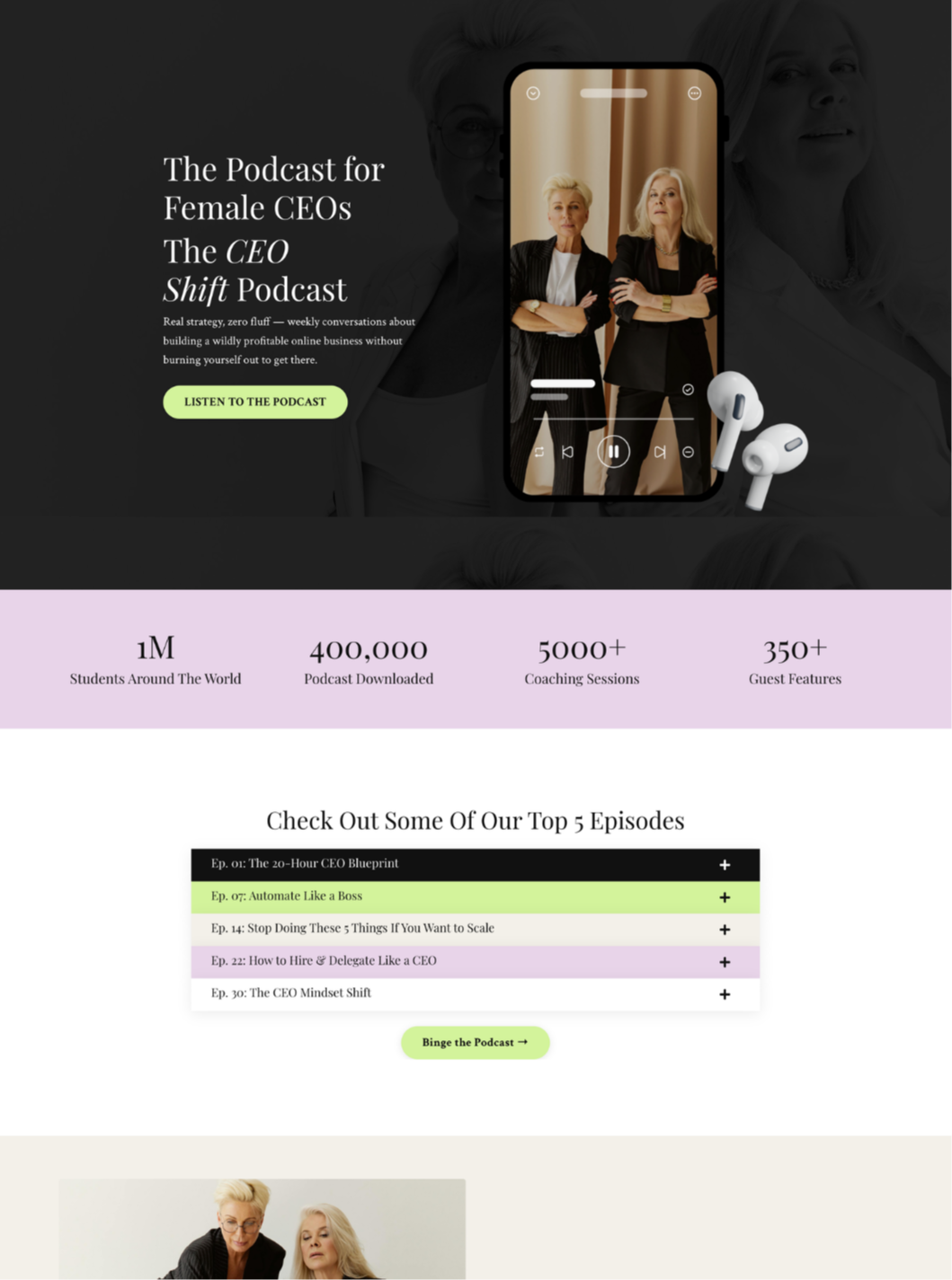 Bold hero, stats showcase, program lineup, podcast section, and blog previews.